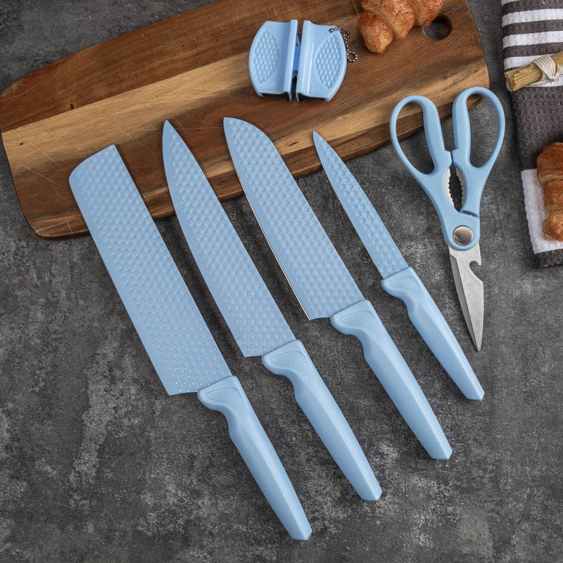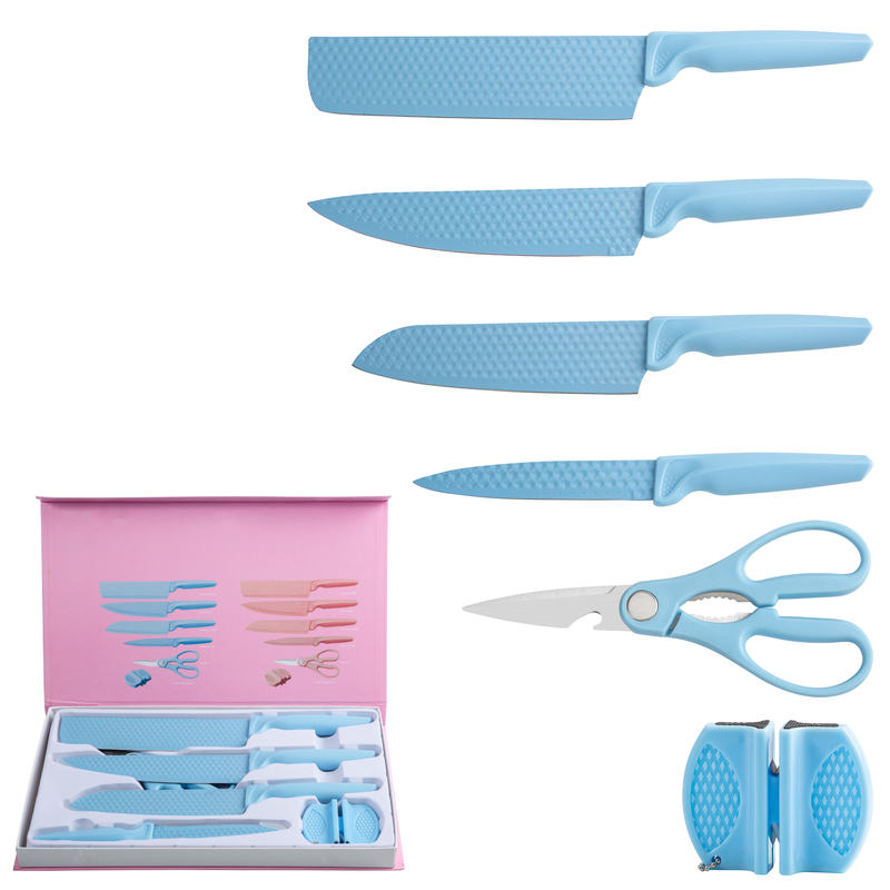 Factory Supply Macarons Blue Non-Stick Coating 6-Piece Set of Colorful Stainless Steel Kitchen Knives with Gift Box for Cutting