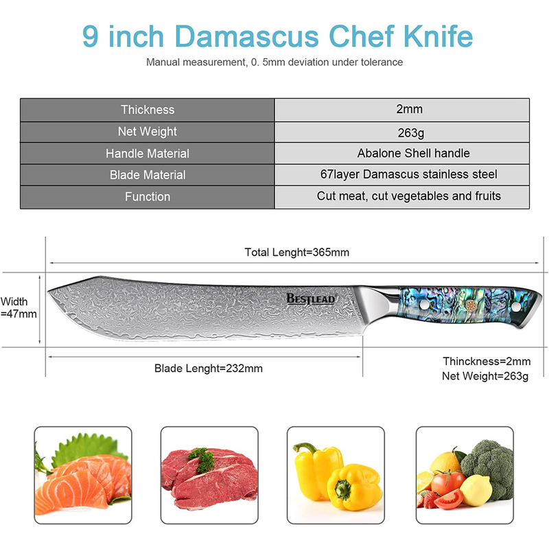 Factory Wholesale 9 Inch Chef’s Knife Damascus Steel 67 Layer Abalone Shell Handle Sharp Kitchen Knives