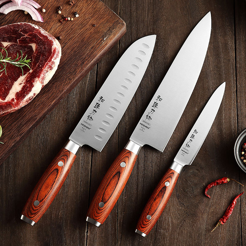 HEZHEN 3 Pcs Razor Sharp Kitchen Chef Knife Set German 1.4116 Stainless Steel Pakka Wood Handle Manufacturer