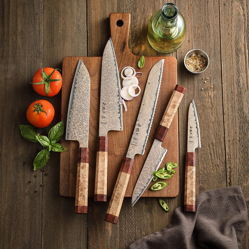 HEZHEN Exquisite Copper Damascus Steel Knife Set Super Sharp Octagonal Wood Handle Custom Kitchen Chef Slicing Knives Gift