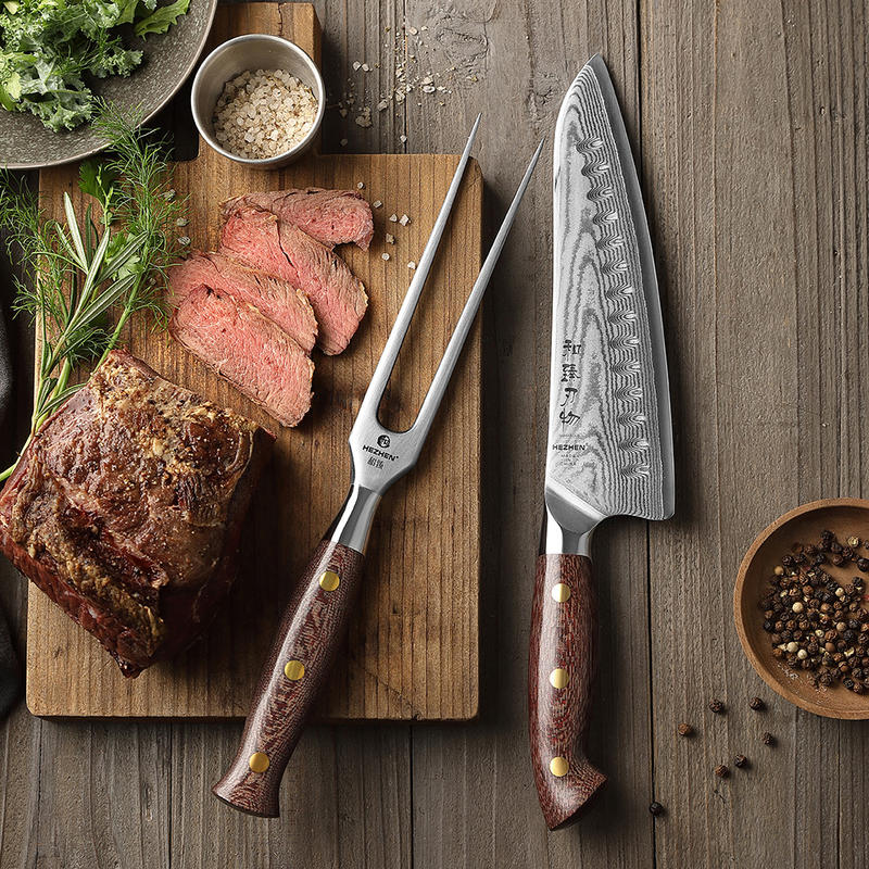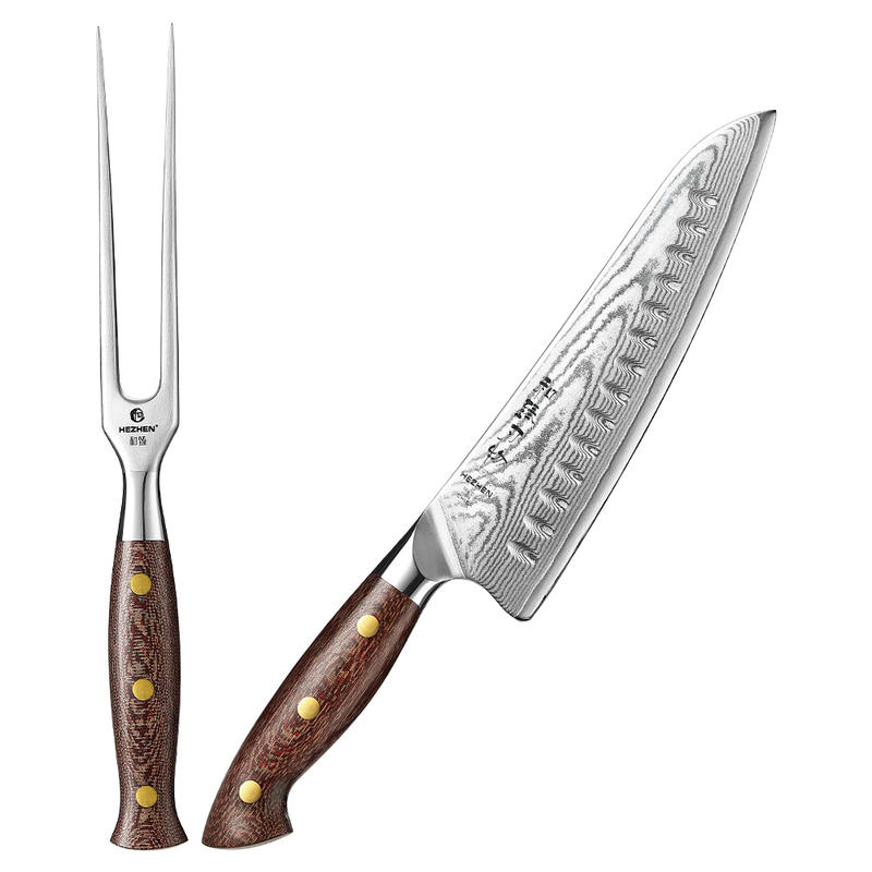 HEZHEN Granton Edge Chef Knife Carving Fork Set High Quality Damascus Steel Micarta Handle Sharp Kitchen Knives