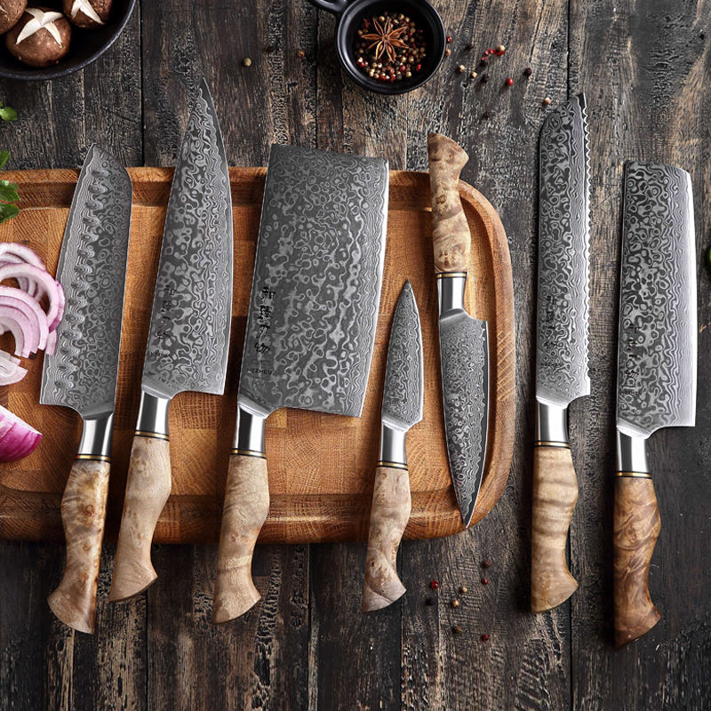 HEZHEN Hot Sale Luxury Damascus Steel Knives 7 Pcs Kitchen Knife Set With Figured Sycamore Wood Handle