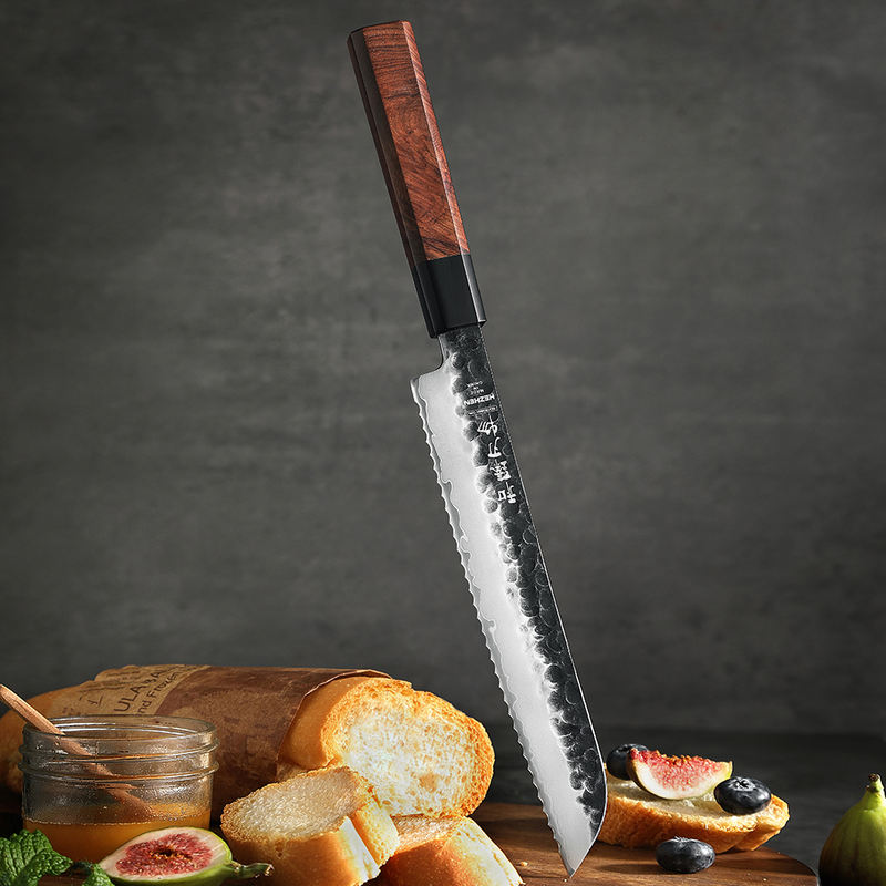 HEZHEN New 8.5 Inch Bread Knife 10Cr Core Stainless Steel Kitchen Chef Knives Red Wood Handle Handmade