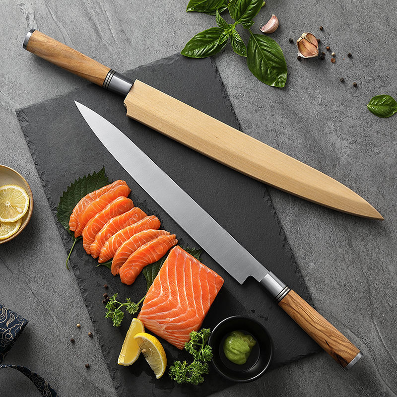 HEZHEN New Stainless Steel Kitchen Sushi Knives Olive Wood Handle Sharp Japanese Slicing Sashimi Knife With Wooden Sheath