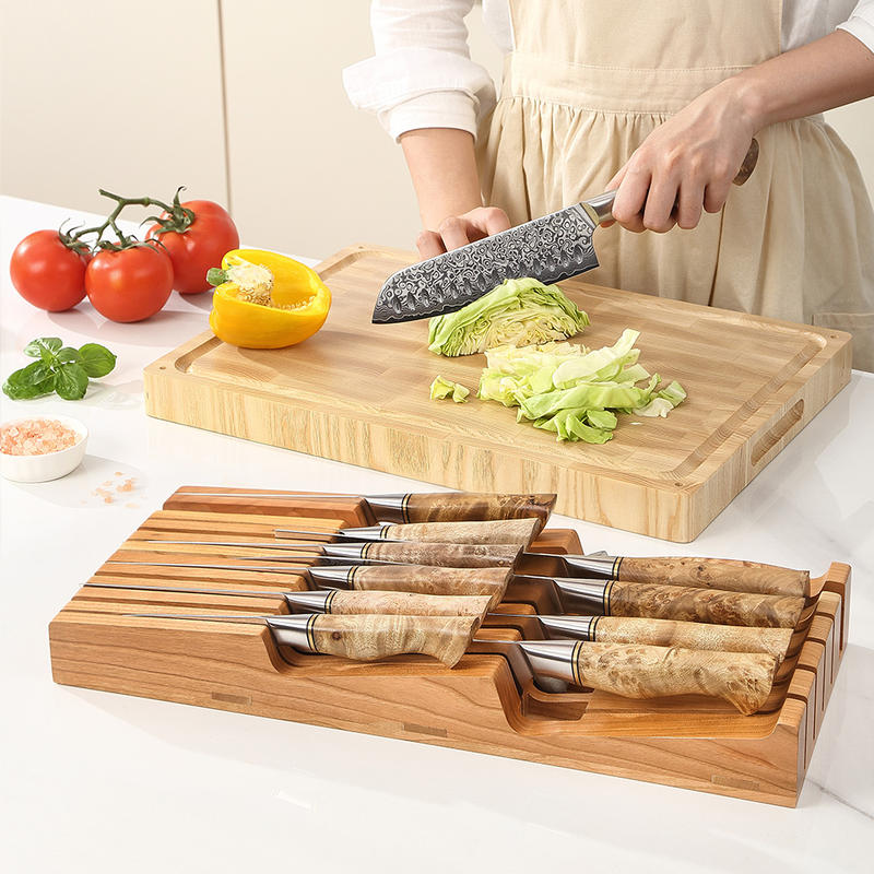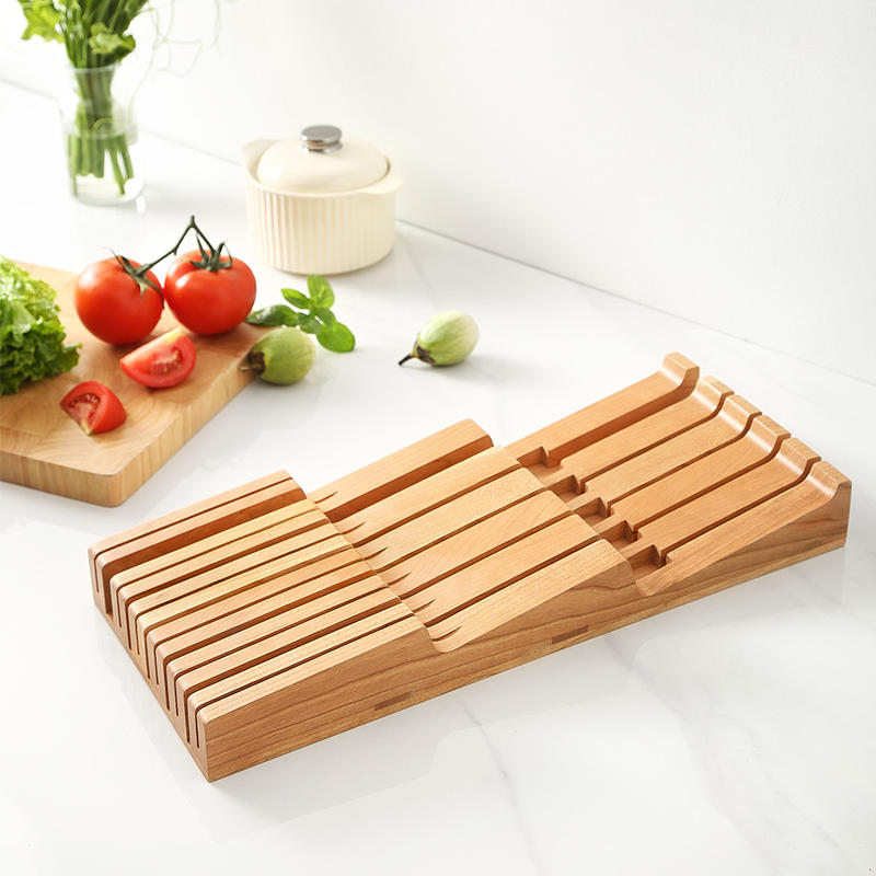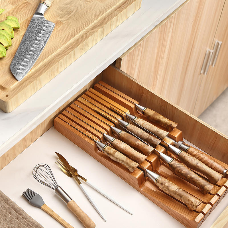 HEZHEN Universal In-drawer Knife Organizer 11 Slots Storage Kitchen Knives Tray Cherry Wood Holder