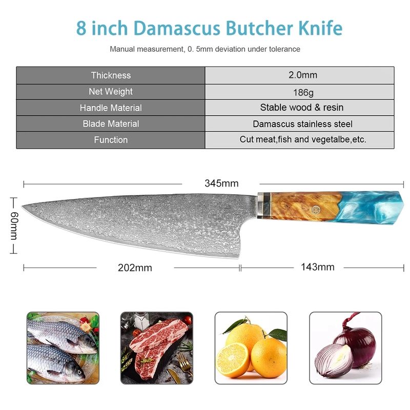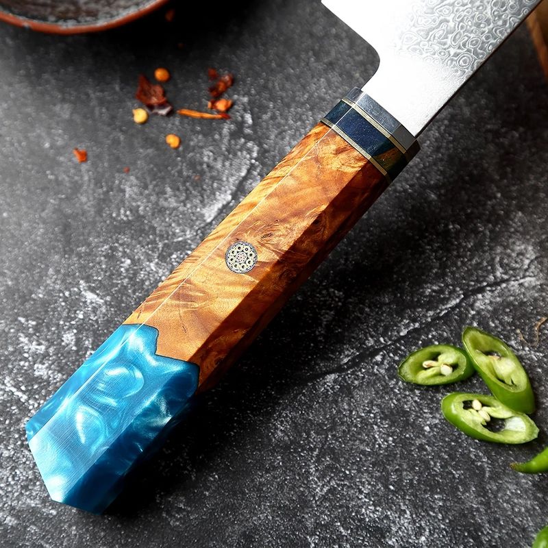 High Carbon 8 Inch 67 Layers Damascus Steel Kitchen Chef Knife with Blue Resin Octagonal Handle