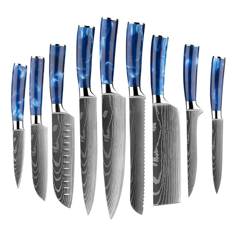 High Quality 10 Piece Japanese Stainless Steel Dyed Santoku Knife Set with Blue Resin Handles