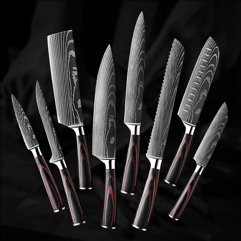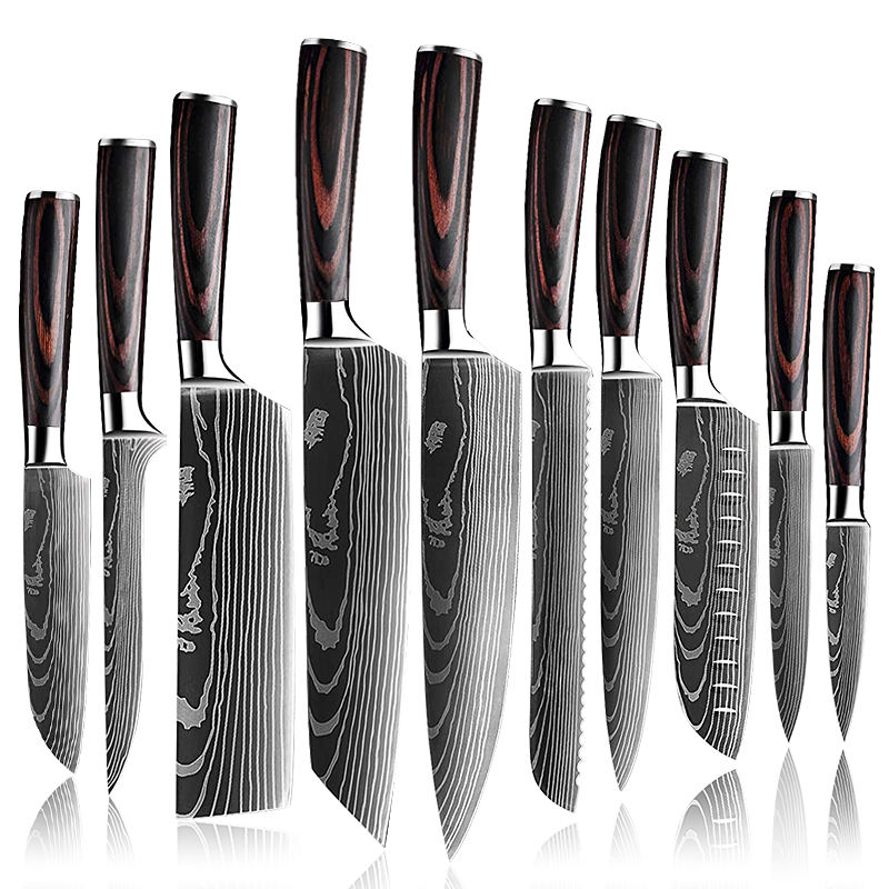 High Quality 10 Pieces Stainless Steel Laser Pattern With Wooden Handle Gift Box Chef Damascus Knife Set