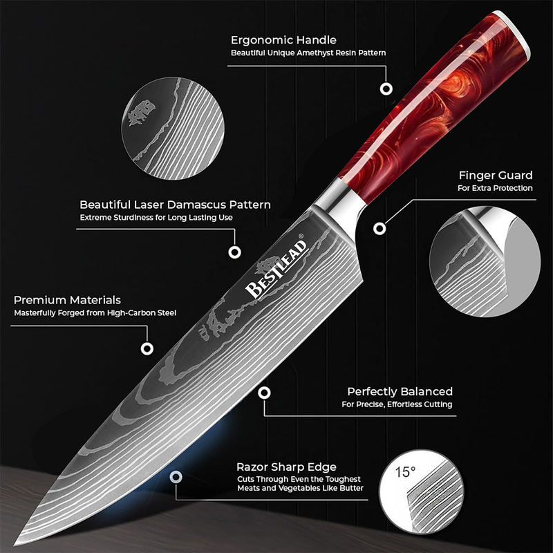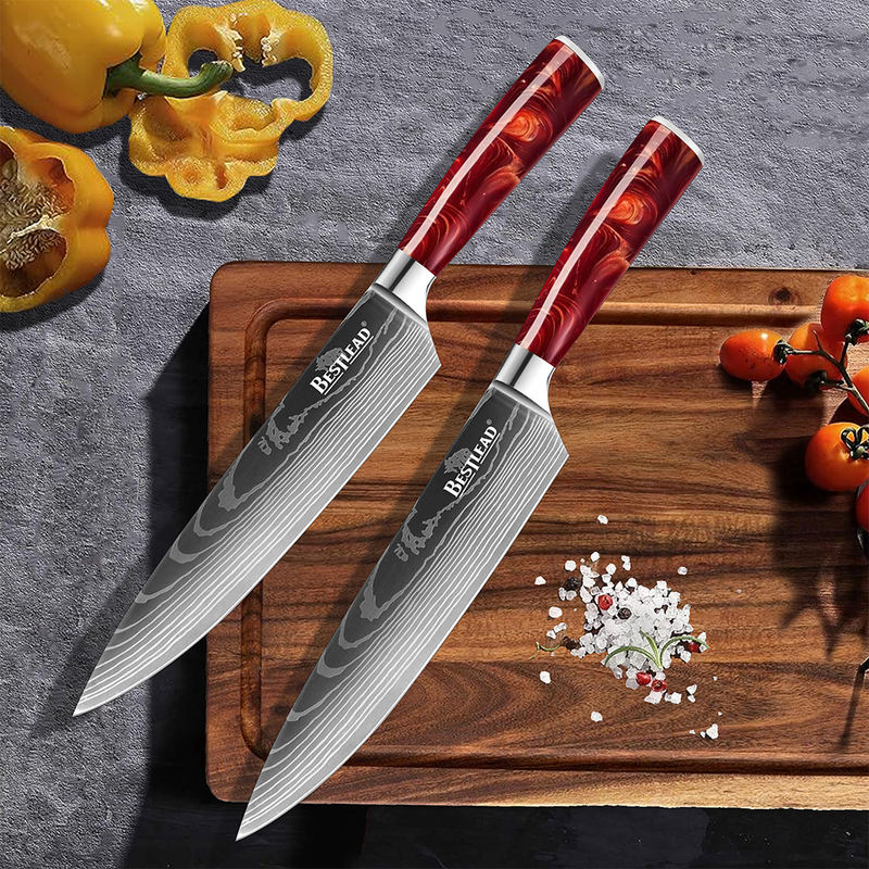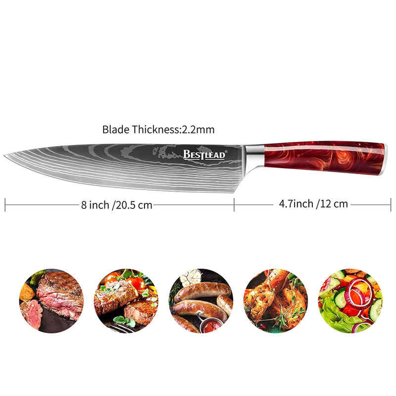 High Quality 4cr13mov Stainless Steel Chef Knife with Red Resin Handle Damascus Laser Pattern