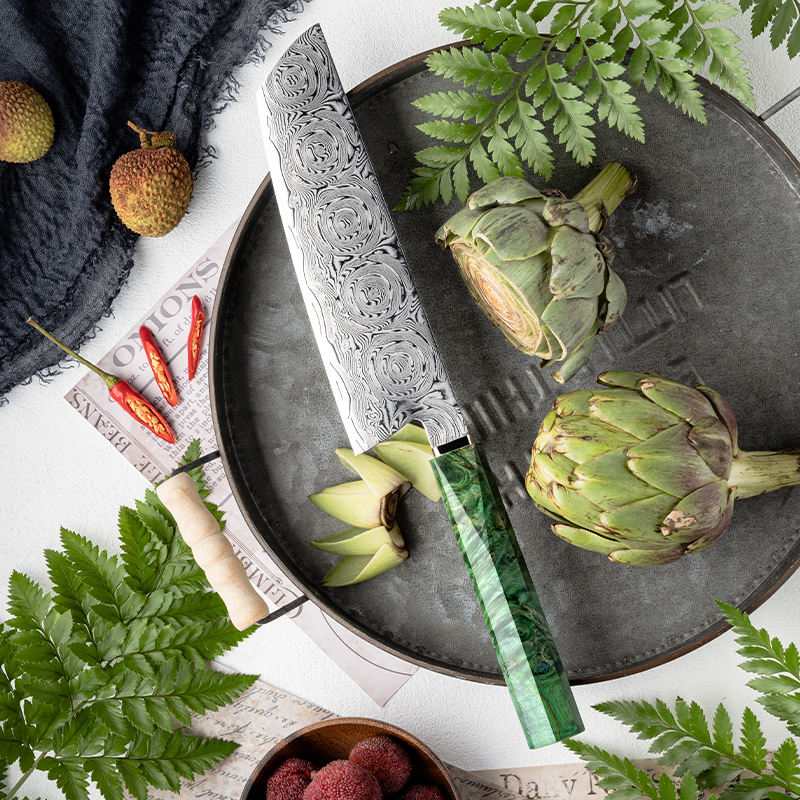 Japanese 7 Inch Damascus High Carbon Steel Kitchen Knife Nakiri Knife with Solidified Wood and Copper Bolster Handle